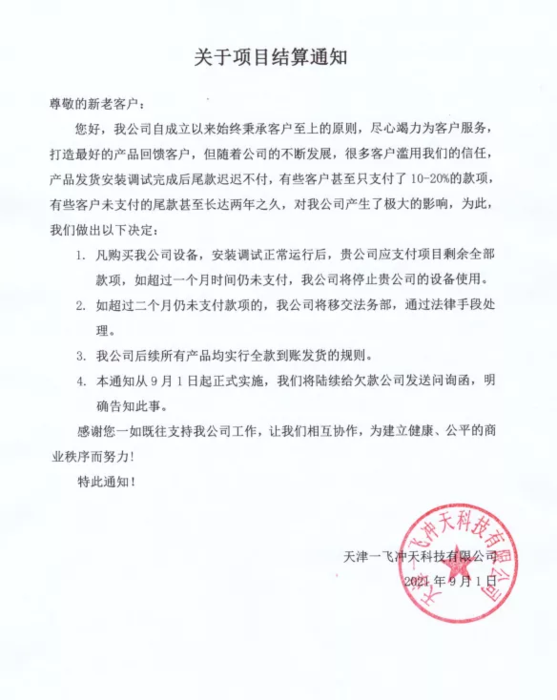 NEWS ◆ 最新消息 ◆ 尊敬的新老客户 您好,我公司自成立以来始终秉承客户至上的原则,尽心竭力为客户服务,打造最好的产品回馈客户,但随着公司的不断发展,很多客户滥用我们的信任,产品发货安装调试完成后尾款迟迟不付,对我公司产生了极大的影响,为此我们做出以下项目结算内容中的决定,本通知从9月1日起正式实施,感谢您一如既往支持我公司工作,让我们相互协作,为建立健康、公平的商业秩序而努力! 项目结算通知